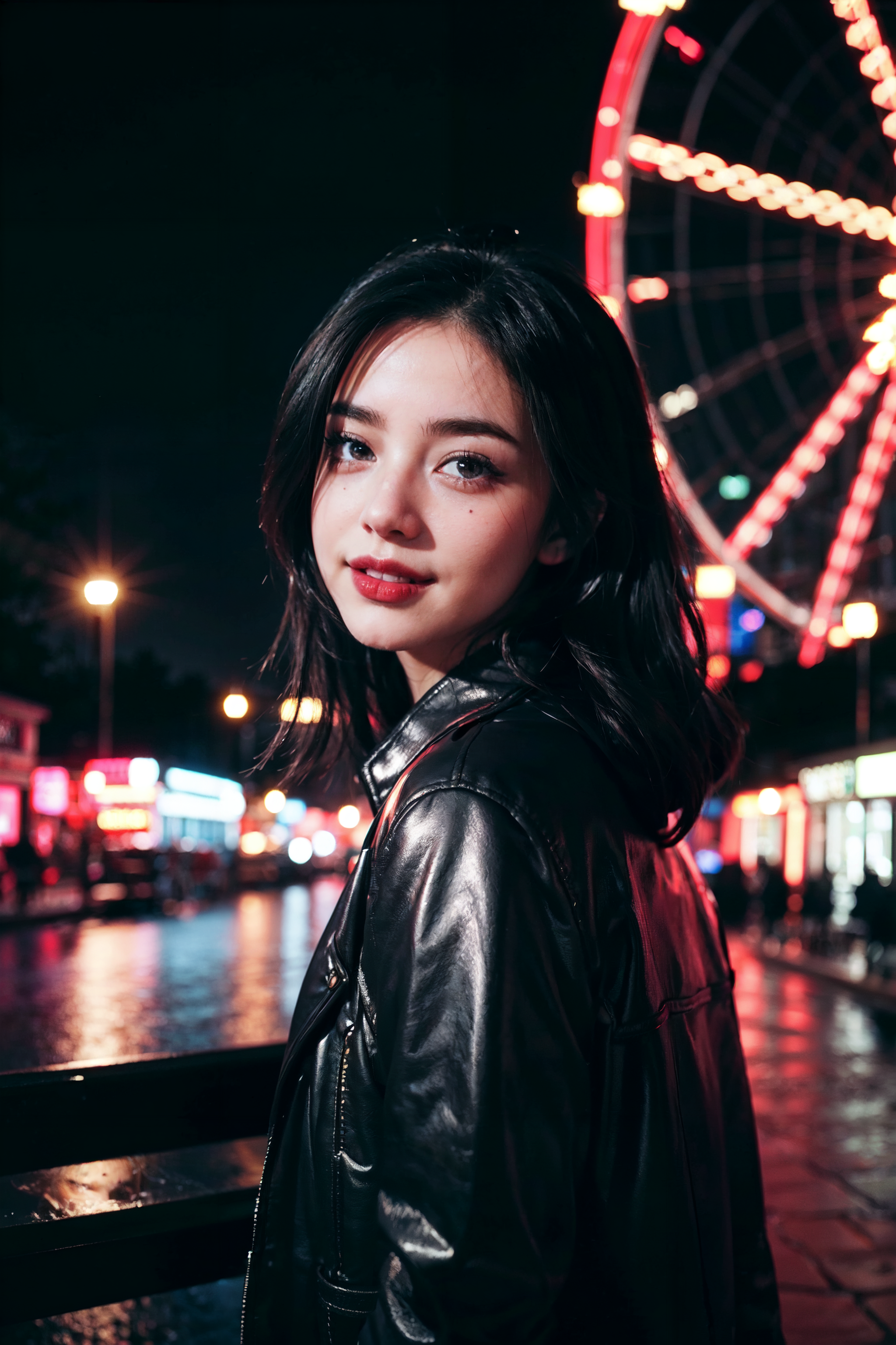 1girl, pale skin, eyeliner, long black hair, looking at viewer, light smile, joy, beautiful face, black coat, winter, ferris wheel, neon lights, night, clear sky, vibrant colors, vibrant details, dynamic composition, photorealistic, highly detailed, intricate details, colorful background, rim lights, dslr, soft lighting, film grain, cinematic, 8k, <lora:gothgirl:0.8> gothgirl, best quality, masterpiece