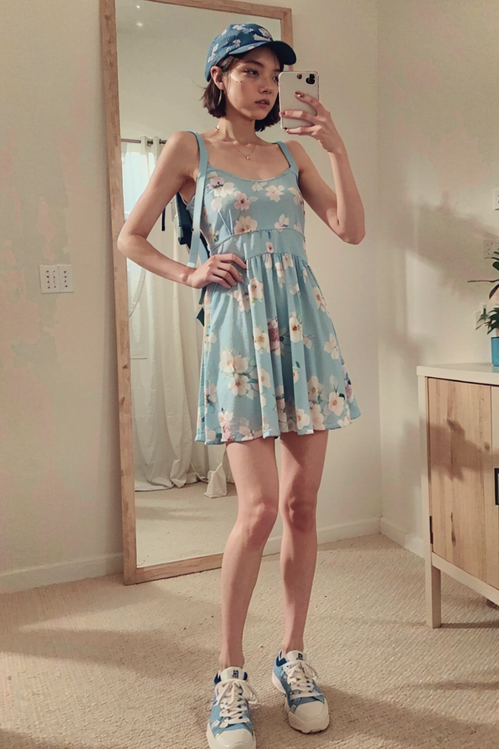 (masterpiece, RAW photo, highly detailed), a photo of yum1 woman wearing (long blue floral dress, sneakers, backpack, fishing hat), (short hair), (slim and skinny body, small breast), indoor, standing, <lora:Yumi:0.8>, fullbody, professional photoshoot, <lora:epiCRealismHelper:1>, taking a selfie mirror
