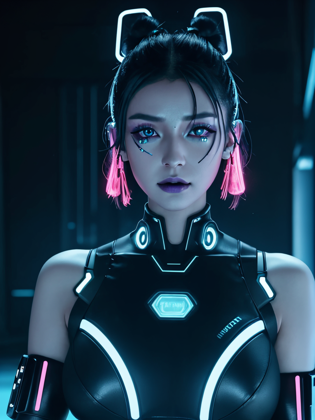 Portrait from the waist up of KARINA from AESPA as a cyberpunk android. She has a half-shaved neon blue asymmetric bob, glowing cybernetic eyes with neon pink irises, and piercings across her nose and ears. She wears a black mesh top with a high tech bionic shoulder and arm decorated with glowing holographic tattoos and wires plugged into data ports on her neck. Her other arm is also a robotic augmentation covered in wires and tech. She stands in a dark alley dramatically backlit by vibrant neon signs and holograms streaming data code around her. Cinematic vivid lighting and shadows. Realistic, futuristic, neon.