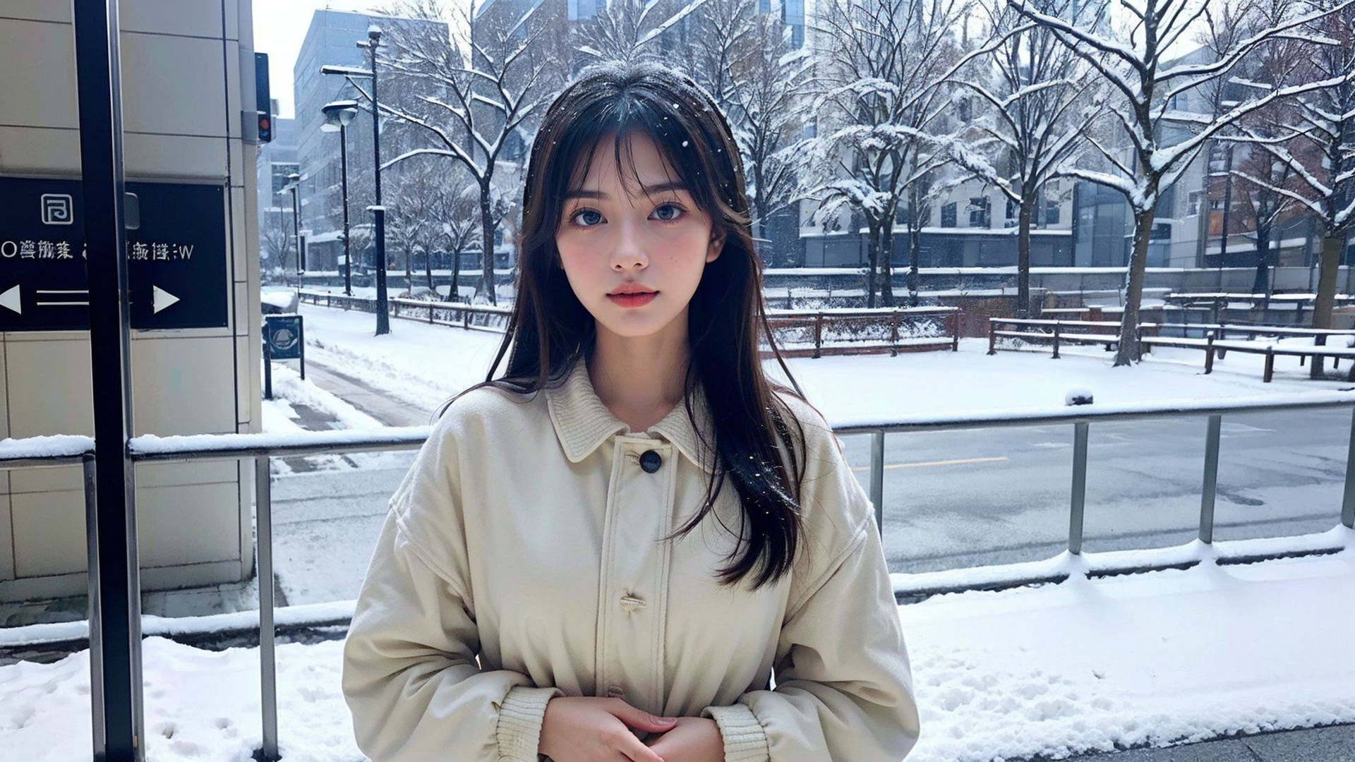 Alice from USA, long combed [auburn:crimson:.4] hair, (1girl:2.7),(driver shot:1.3),gyaru,(just one photo:1.5),makeup,slender face,pony-tail,slender_waist,japanese idol,black hair,snow,winter_clothes,winter_coat,airport,it is snowing,
