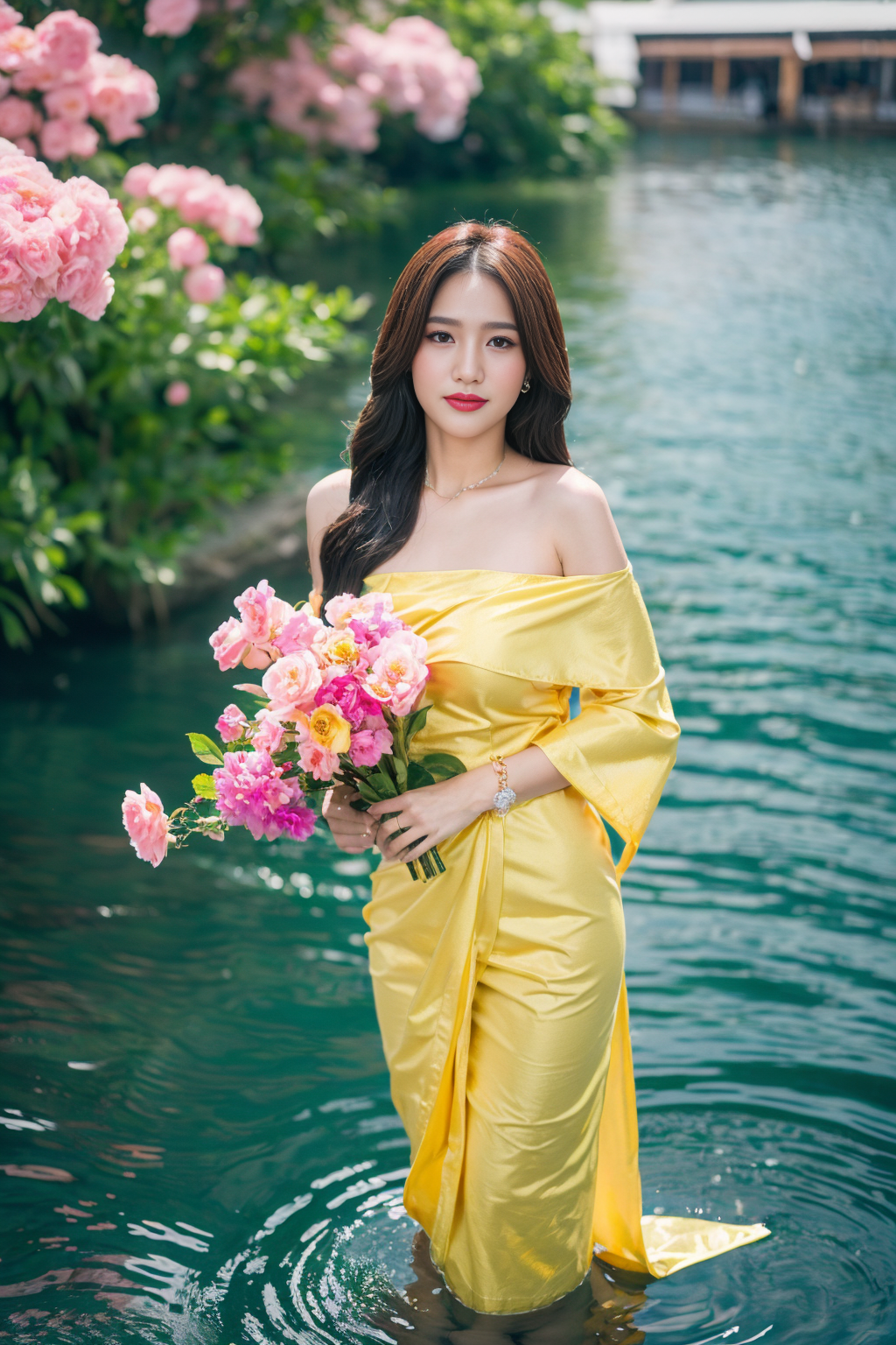 (best quality:1.4), (ultra highres:1.2), (photorealistic:1.4), (8k, RAW photo:1.2),(portrait shot:1.3), kpncy_, 1girl, solo, long hair, full body, bokeh, depth of field, (long shoulder sabai:1.4), (jewelry:1.4), (floating sabai:1.4), yello dress, water, flower, <lora:kpncy_-000002:0.8>, <lora:sabai6:0.6>