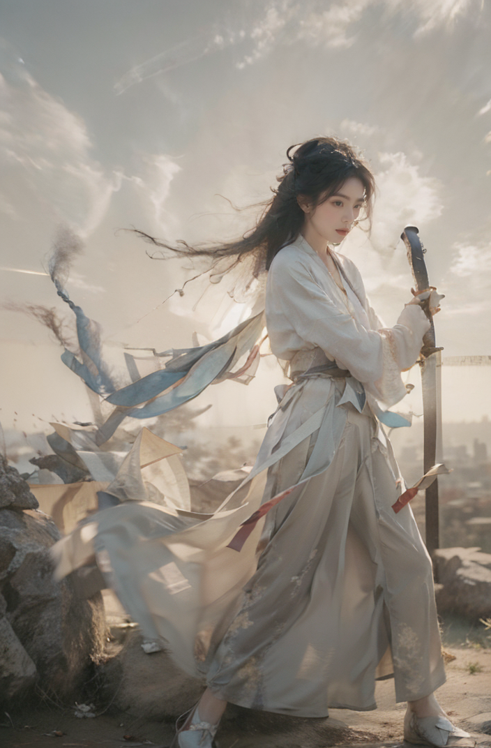 <lora:MengX girl_Mix_V40:0.9>,(sword dance),(all swords return to the family:1.5),((practise swordplay)),(on a hill:1.5),kung fu,Best quality,masterpiece,ultra high res,photorealistic,raw photo,unity 8k wallpaper,cinematic lighting,sunset,dappled sunlight,golden hour lighting,backlighting,(lens flare),wind,pastel colors,soft light,1girl,(long hair reaches to the waist:1.2),floating hair,tai chi