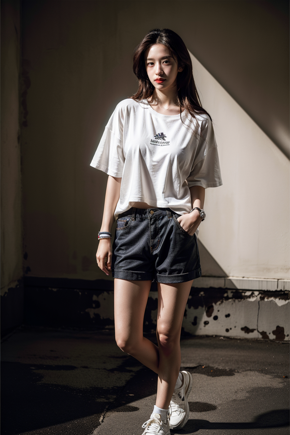 1girl, solo, portrait, standing, dynamic pose, pale skin, smooth skin, beauty, light makeup, medium breasts, looking at viewer, oversized shirt, biker shorts, sneakers, black wristband, (masterpiece:1.2), best quality, ultra high res, raw photo, perfect lighting, soft light, rim light, (realistic, photorealistic:1.4),