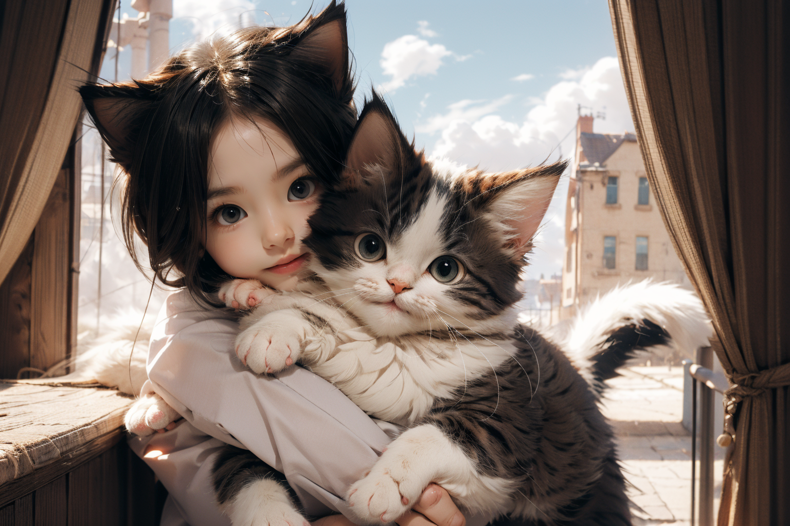 looking at viewer, 1girl, cat tail, BREAK the girl is hugging the gaint cat, cat, cloud, city <lora:cat_20230627113759:0.9>, <lora:Hanna-000002:0.2>, <lora:add_detail:0.4>, ultra realistic,32k,RAW photo,(high detailed skin:1.2), 8k uhd, dslr, soft lighting, high quality, film grain