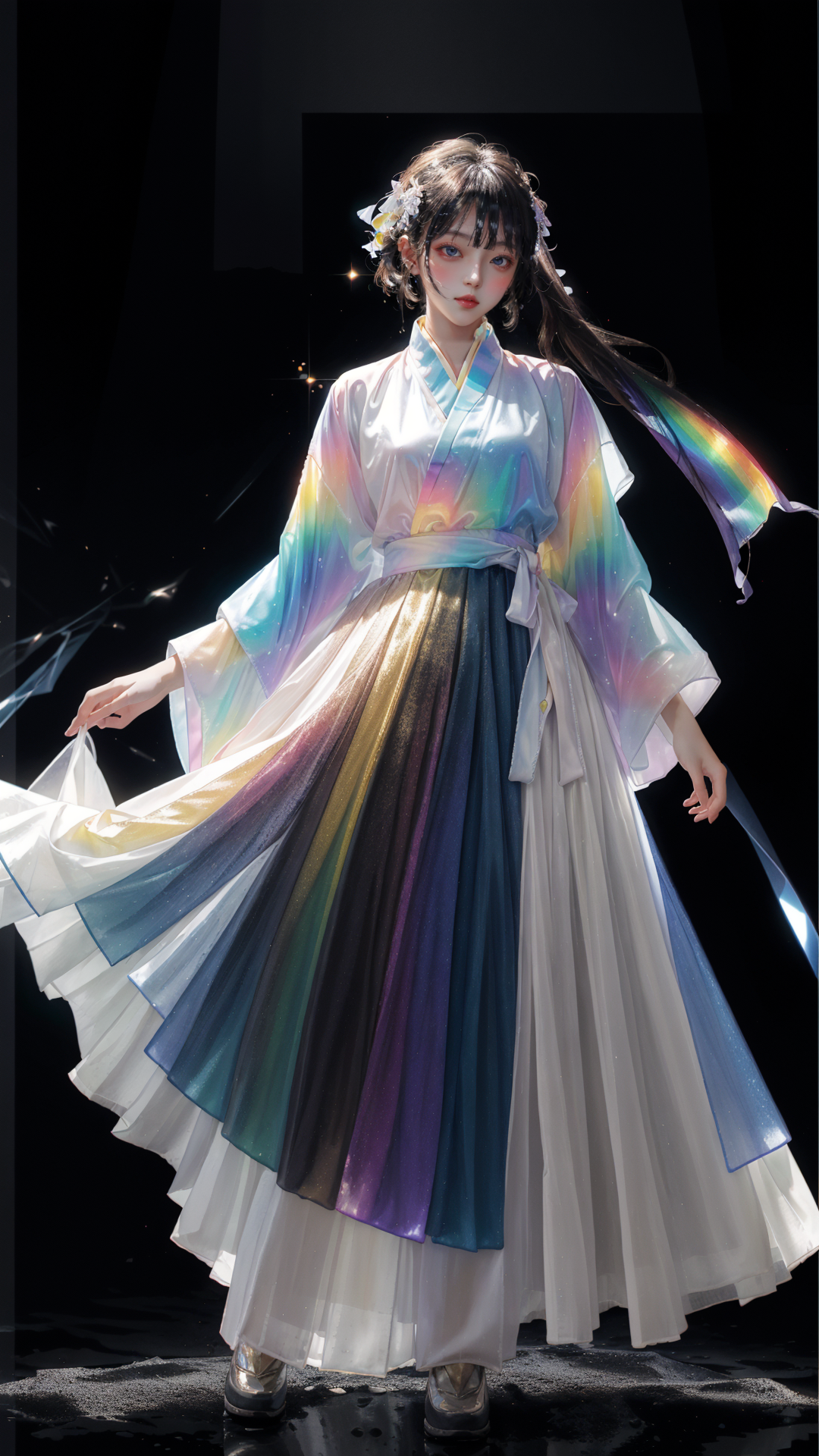 masterpiece, best quality,highres, 1girl, liuli2, tall, long straight hair, perfect stature, white dress, fashion pose, bangs, look_at_viewer, chromatic dispersion,metallic_lustre, see_through, (tansparent_plastic:1.3), coloured glaze, Polychromatic prism effect, rainbowcore, iridescence/opalescence, glowing colors, aluminum foil, Glowing ambiance, black_background, <lora:liuli2:0.7>, Tyndall Effect, <lora:hanfu40-beta-3:0.3>, hanfu