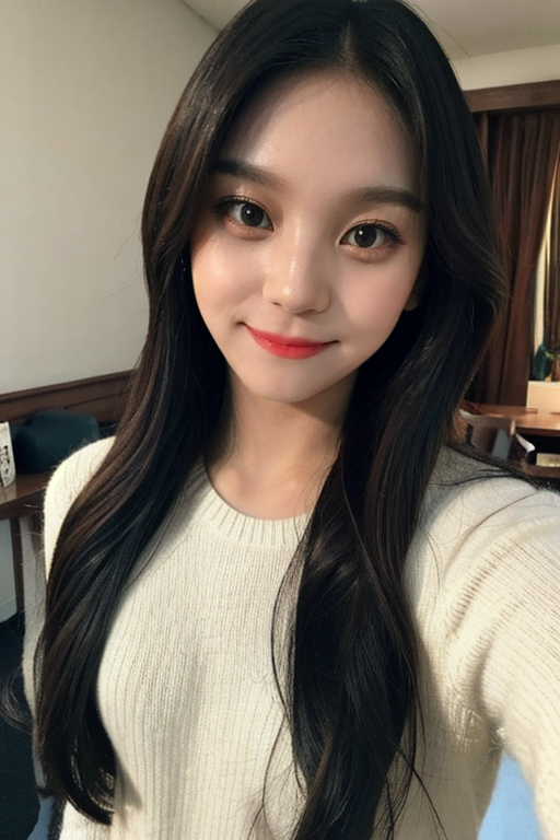 1girl,(masterpiece:1.2), (best quality:1.2), (extremely detailed), (selfie from center front), (extremely detailed face), (((ultra-detailed eyes and pupils))), (ultra detailed), 8k, photorealistic, pretty face, (((smile))), instagram shot, instagram style, in the bedroom, looking at viewer, facing front, perfect skin, cinematic lighting, fair skin, black hair, black eyes, upper body, portrait photo, slim, slender, no makeup, nikon RAW photo, 8k ,Fujifilm XT3, photorealistic, armpits, detailed face, fair skin, perfect shape,indoors, knit sweater, dim lighting, bangs, (looking at viewer:1.2), <lora:umjilorashy:1>