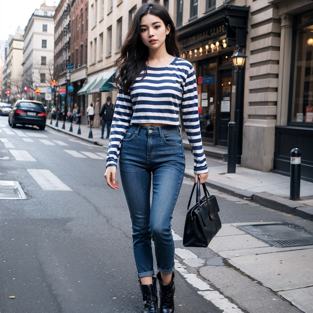 1girl,long hair,striped shirt,full body,jeans,Leather boots,<lora:haihun:0.8>