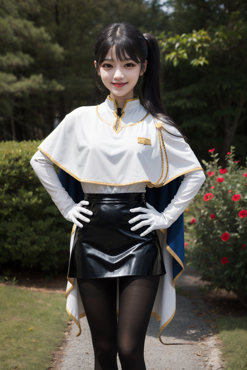 masterpiece, best quality, highres, bbruri, long hair, yellow eyes, white capelet, long sleeves, white gloves, black skirt, pantyhose, <lora:hoshino_ruri_v1:0.7>, hand on hip, smile, standing, outdoors