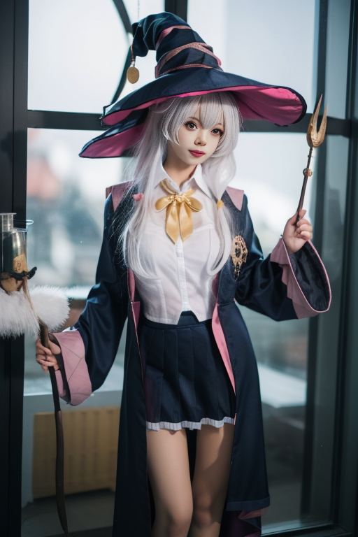 ltra-detailed,highly detailed,best quality,masterpiece,illustration,realistic,photorealistic, elaina, witch, wizard, elaina \(majo no tabitabi\), cosplay, 1girl, solo, open robe, collared shirt, long sleeves, wide sleeves, pleated skirt, witch hat, bowtie, frilled skirt, jewelry, badge, long hair, bangs, hair between eyes, grey hair, hair ribbon, hair bow, holding wand, looking at viewer, cowboy shot, standing, indoors, window, day, <lora:elaina_v1_06:0.9>