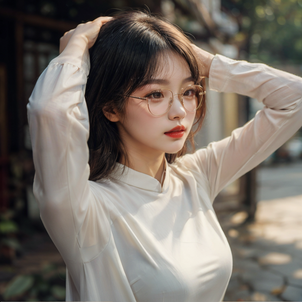 1girl, portrait, standing, black hair, red lips, glasses, <lora:a0d4ivn:0.6> Vietnam traditional costume, <lora:add_detail:1>, (masterpiece,best quality:1.5), ultra realistic,32k,RAW photo,(high detailed skin:1.2), 8k uhd, dslr, soft lighting, high quality, film grain