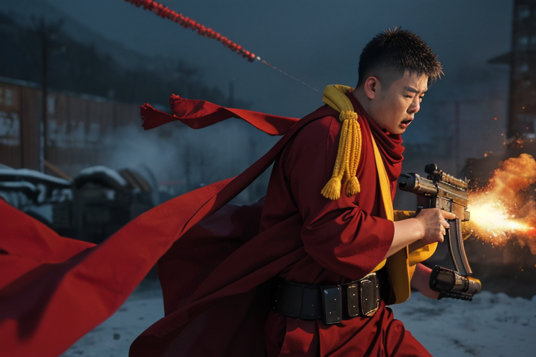 A buddhist monk firing a heavy machine gun. Prayer beads around his neck. He carries grenades around his belt. He wears multiple layers of robes in red and yellow. Muzzle flare. Bullet shells mid-air. Action-packed, it's a scene from a Hollywood movie. Extremely detailed, raw photo, best quality, masterpiece, award-winning photography, huge filesize, 8k, highres,