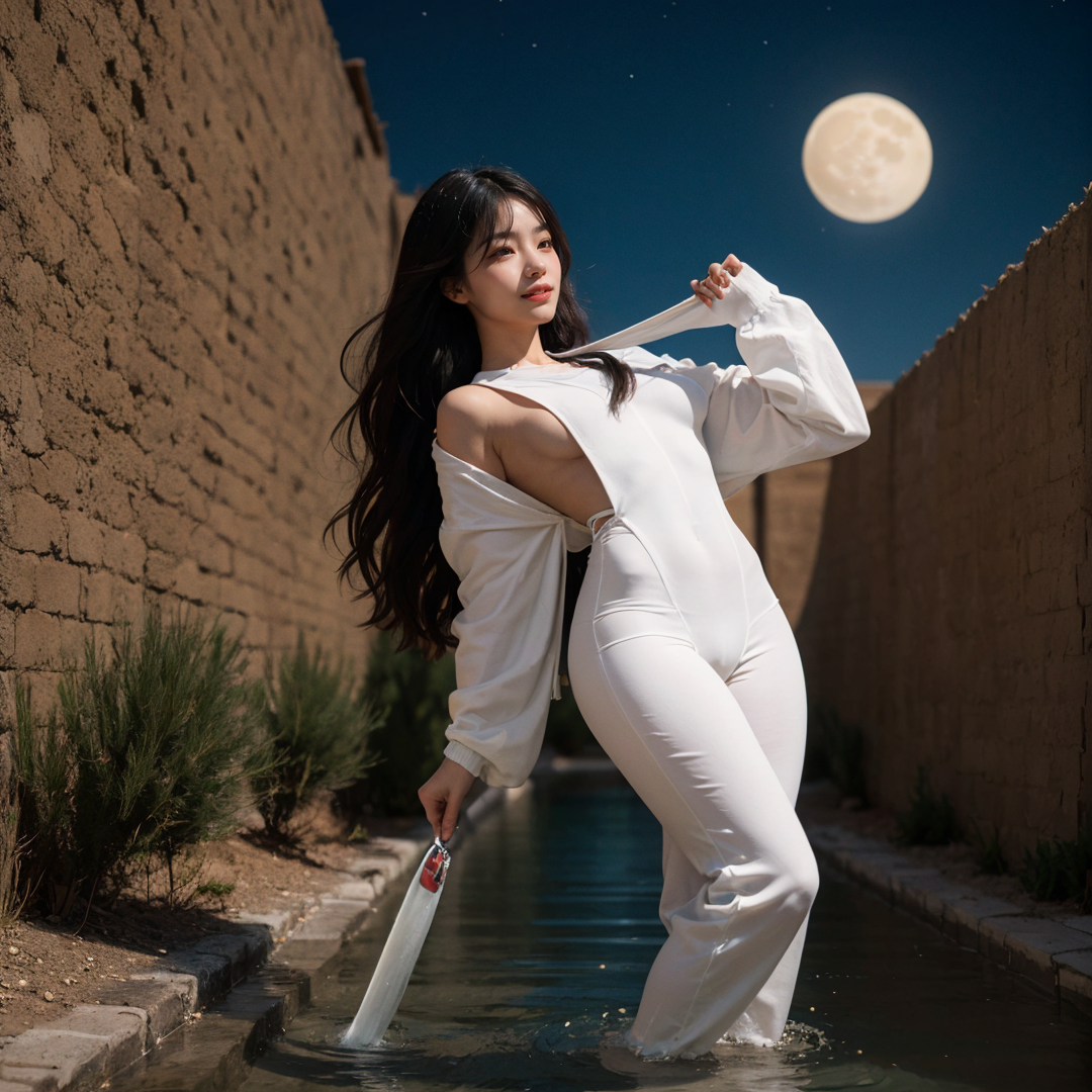 Harriet, long wavy hair, (Best Quality, 8k, 32k, Masterpiece, UHD:1.2),best picture quality,(thin mold:1.2),(a super detailed image:1.2),(1girl:1.2),very cute and beautiful woman,<lora:GoodHands-vanilla:1>,realistic,(full body:1.2),smile,<lora:flat2:1>,<lora:add_detail:1>,17 years old,desert wilderness,oasis,bodysuit,some planet,(big moon in the sky:1.2),water fountain,(sunglasses:0.7),black hair,japanese,super-wide-angle,japanese idol,perspectives from a distance,look up from below,desert vehicles,