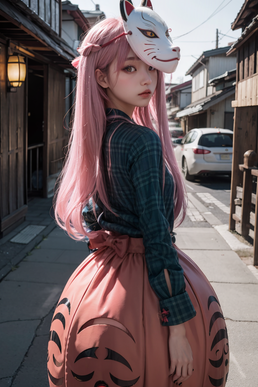 masterpiece, best quality, <lora:HatanoKokoro:1>,hata no kokoro,1girl, long hair, mask, shirt, solo, plaid shirt, skirt, pink hair, fox mask, bubble skirt, expressionless, plaid, pink eyes, long sleeves, bow, noh mask, looking at viewer, very long hair, oni mask