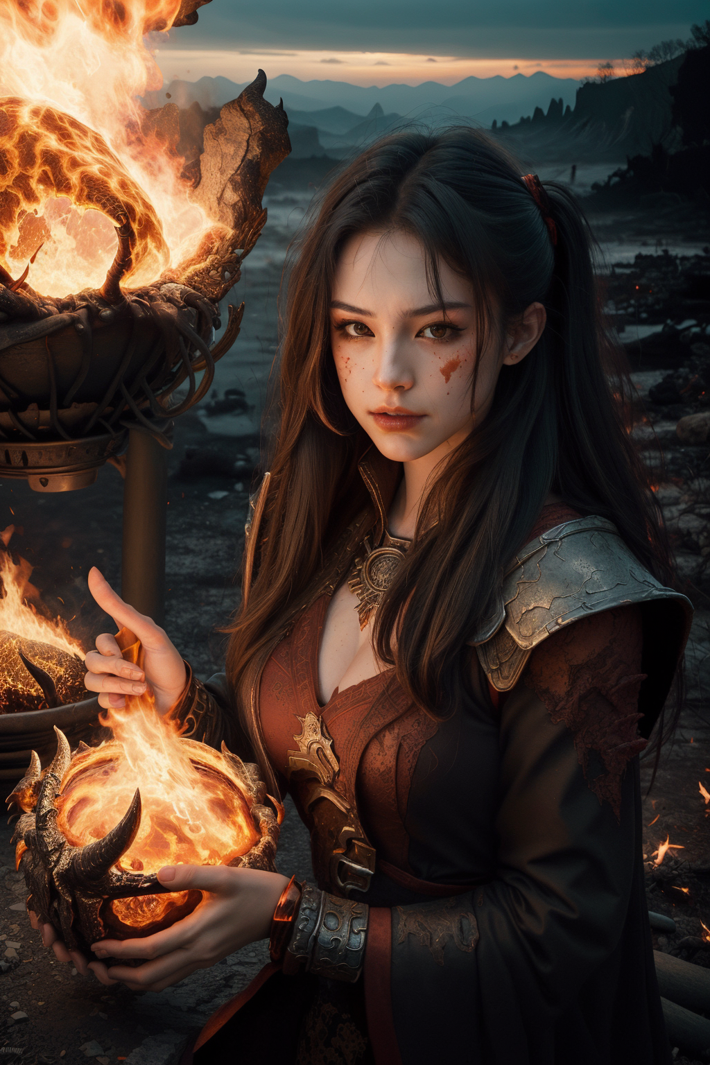 RAW photo, cowboy shot, adult female, portrait, solo, (full body:0.6), detailed background, detailed face, (<lyco:HorrorBundlev4:0.4>, 1nf3rnalAI, infernal theme:1.1) primal fury, angry expression, elemental fiery armored champion, [heavy armor:molten rock:2], covered in molten rock, ruby gemstone, lava, cracks, heat, pyromania, glowing aura, bonfire in background, <lora:Fire_VFX:0.3>, (style-swirlmagic:0.8), epic fiery atmoshpere,, 105mm professional photography, analog photography, detailed background, sfw, (high detailed skin:1.2), 8k uhd, dslr, soft lighting, high quality, film grain, Fujifilm XT3, <lora:breegirl:1.0>, breegirl, <lora:add_detail:0.3>