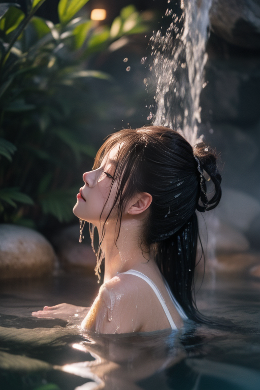 ltra-detailed,highly detailed,best quality,masterpiece,illustration,realistic,photorealistic, onsen bath, 1girl, solo, very long hair, bangs, wet hair, partially submerged, looking up, arm up,upper body, outdoors, water, waves, onsen, day, rock, sky, wet, reflection, splashing, scenery, cloud,steam,blurry foreground, <lora:onsen bath_v2_04:1.0>