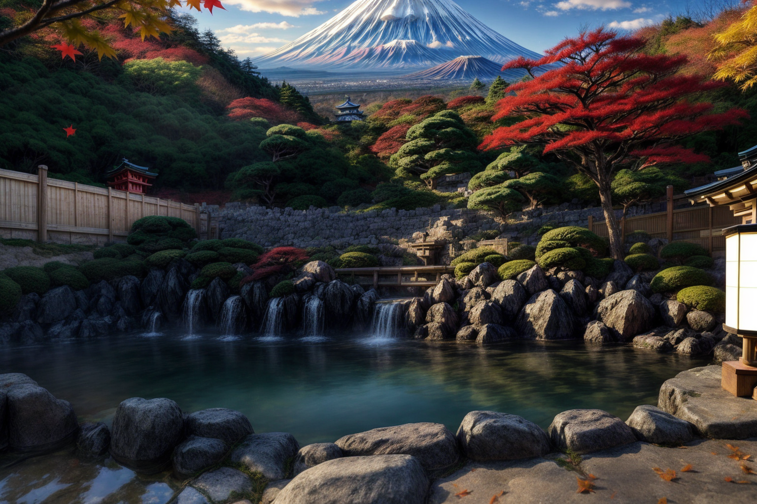 (Traditional Japanese art painting), Mount Fuji in the distance, and the white snow on the top of the mountain as the background, no one in the scenery, bright sunlight shining on the hillside all the way to the hot spring water, making people feel like an epic picture Landscapes, (extremely detailed oil painting: 1.2), glow effects, godrays, hand painted, rendering, 8k, octane rendering, cinema 4d, blender, (dimmed lights at night, daytime blue sky, white Mt. Fuji top, green Mt. Fuji slopes, Ancient castle, temple and shrine, traditional Japanese wooden house complex all the way down the mountain, and traditional Japanese hot spring bath, 4k ultra detailed), cinematic sensibility, sharp focus, humorous illustration, great depth of field, masterpiece, color, 3D octane rendering, 4k, concept art, trending on artstation, surreal, vibrant colors, extremely detailed CG unity 8k wallpaper, trending on ArtStation, trending on CGSociety, intricate, high detail, dramatic, absurd, (face_yolov8n:0.3), <lora:more_details:1.0>, <lora:ARWJapanOnsen:1>, (((close-up Against the background of the ancient castle with white walls in Japan, there is a moat in front of the castle, maple red scene, falling leaves:1.4))), <lora:add_detail:0.7>,