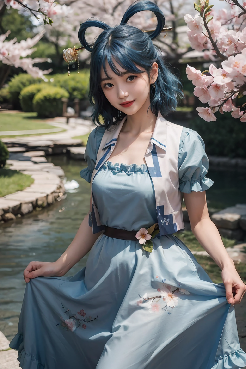 masterpiece, best quality, <lora:KakuSeiga:1>,1girl, kaku seiga, solo, (blue hair:1.2), hair ornament, blue eyes, (shawl:1.2), dress, hair stick, flower, smile, hair rings, skirt hold, vest, branch, short hair, short sleeves, collarbone, puffy sleeves, blue dress, water drop, looking at viewer, open vest, cowboy shot, breasts, frills, puffy short sleeves, belt, medium breasts, cherry blossoms, floral print, (hagoromo:1.2)