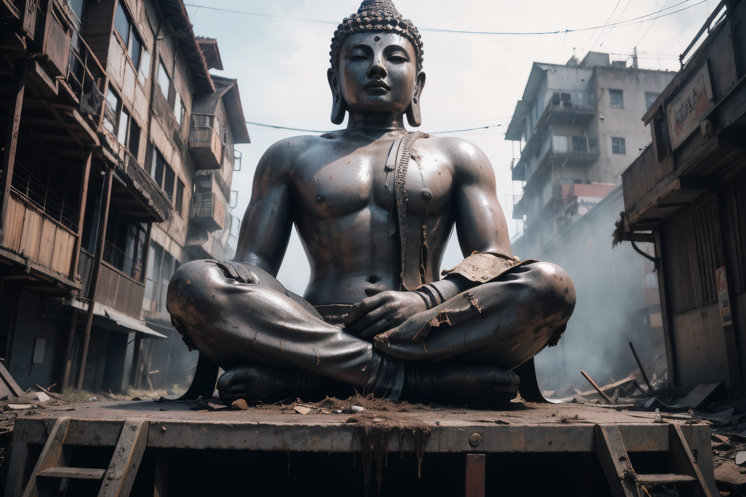 best quality, masterpiece, hyperrealistic, ultra photorealistic, a big buddha, very huge, broken buddha, there's a hole, copper plate forging, expose internal reinforcement structure, some broken, but the majesty remains, <lora:PostApocalyptic_v4:0.4> SZ_4po, enviroment, from below, Noon time and Rainy weather, shabby city background, extremely detailed, texture, 8k, Amazing,