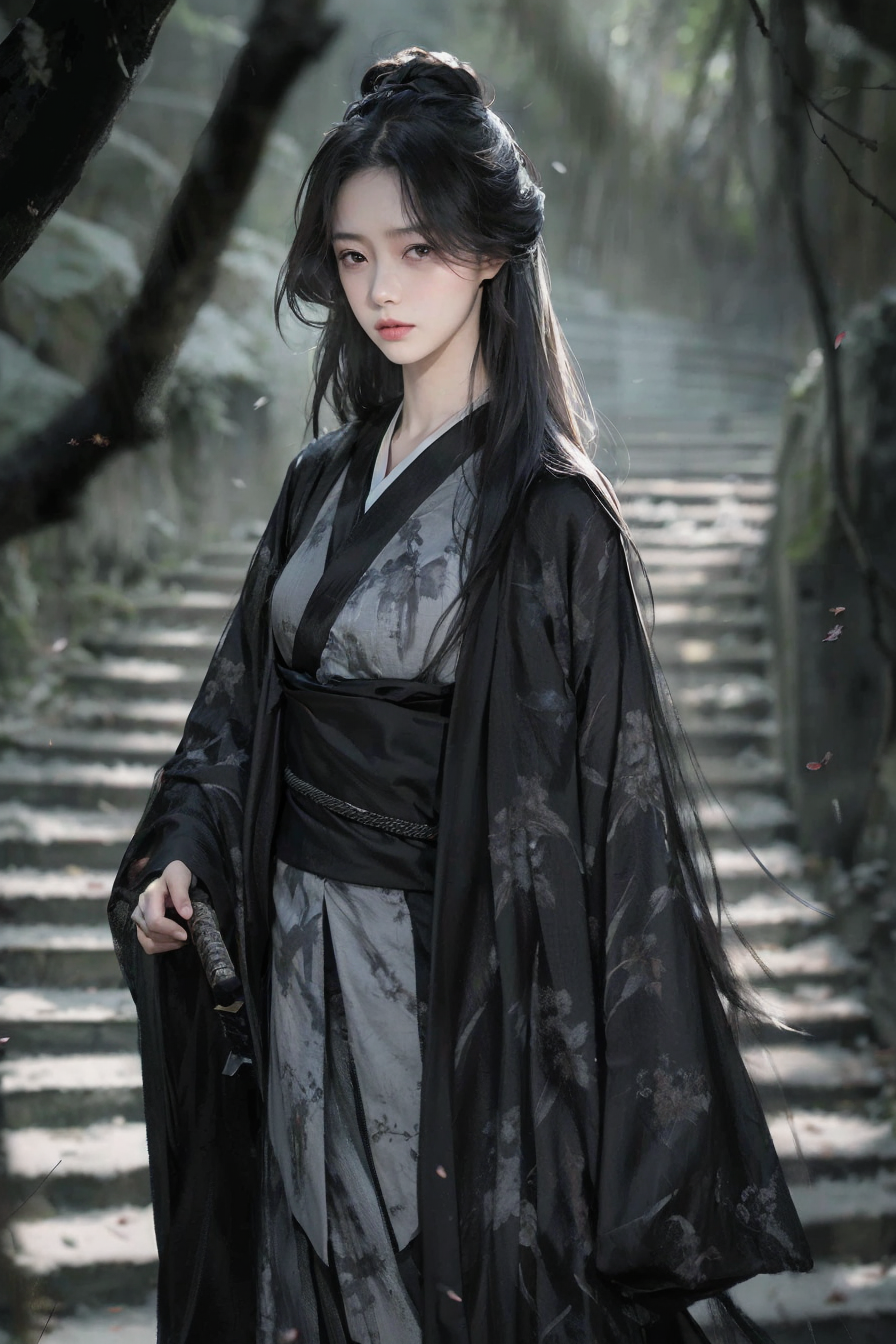 1girl, bare tree, black hair, blurry, blurry background, blurry foreground, branch, brown eyes, cherry blossoms, depth of field, forest, holding, japanese clothes, katana, kimono, long hair, long sleeves, looking at viewer, nature, obi, outdoors, sash, snow, solo, standing, sword, tree, weapon, wide sleeves, winter, (realistic:1.5),(masterpiece, Extremely detailed CG unity 8k wallpaper, best quality, highres:1.2), (ultra_detailed, UHD:1.2),(pixiv:1.3),distinct,detailed face,