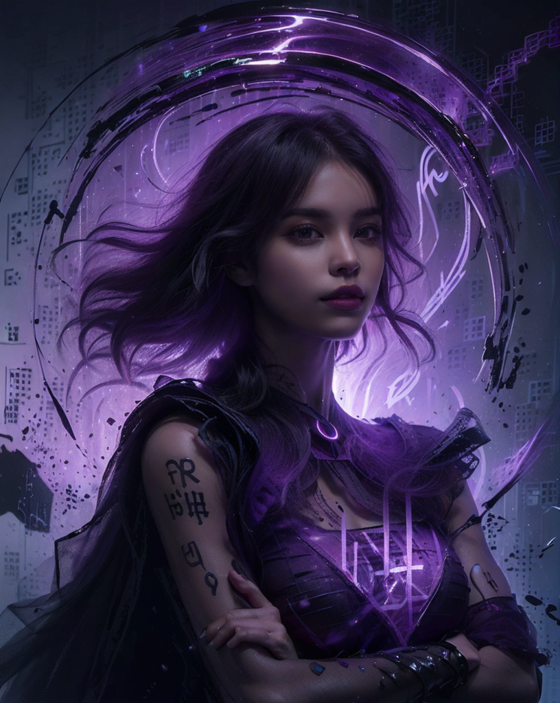 (photorealistic:1.4), 1girl, detailed skin, vellus, crossed arms, confident <lora:JapaneseDollLikeness_v15:0.3> (long black floating hair blown up wind), black sorceress dress with enlaced runes <lora:Clothesmesh:0.5> (Rune_Magic), (purple power:1.4), (spell, purple sparks:1.1), purple fire, GlowingRunes_purple, (style-swirlmagic:0.5) <lora:runemagic:0.7><lora:GlowingRunesAIv4:0.7> <lora:Glowing-Purple-V1:0.5> (rim lighting:1.2), (silhouette:1.3), ( deep shadow:1.1), dramatic, depth of field <lyco:GoodHands-beta2:1.0>