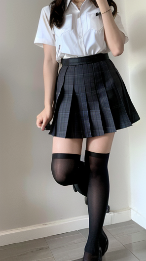 masterpiece, (photorealistic:1.2), beautiful lighting, <lora:jyzjk:0.8>, thigh highs, black skirt, white background, untucked shirt, shoes, full body pic,