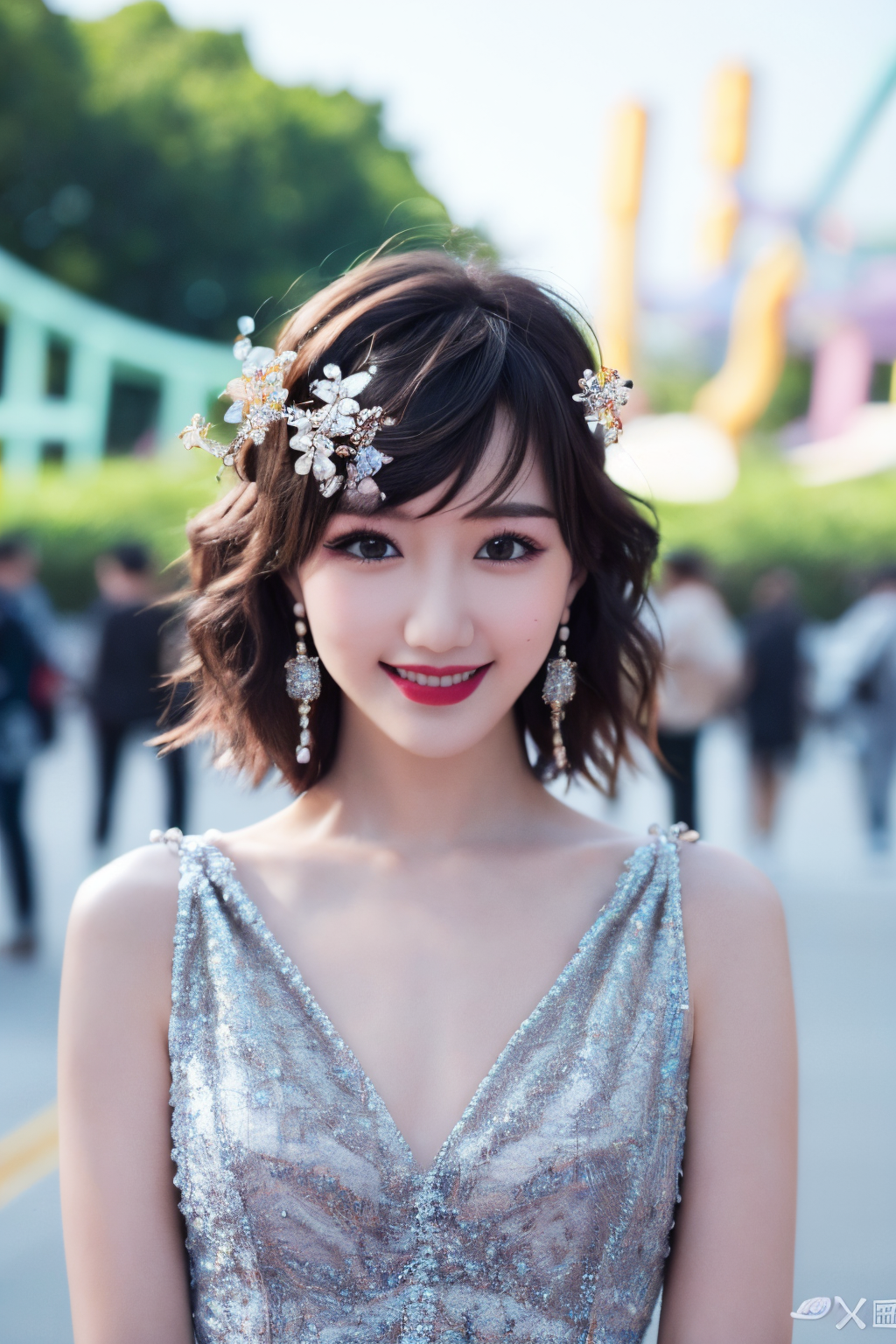 1girl, maoxiaotong, xiaotong, dress, smile, jewelry, earrings, <lora:Celebrity-mao_xiaotong_v2:0.8>, hair flower, cover, looking at viewer, upper body , outdoors , depth of field, amusement park, masterpiece, high quality, highres, realistic,