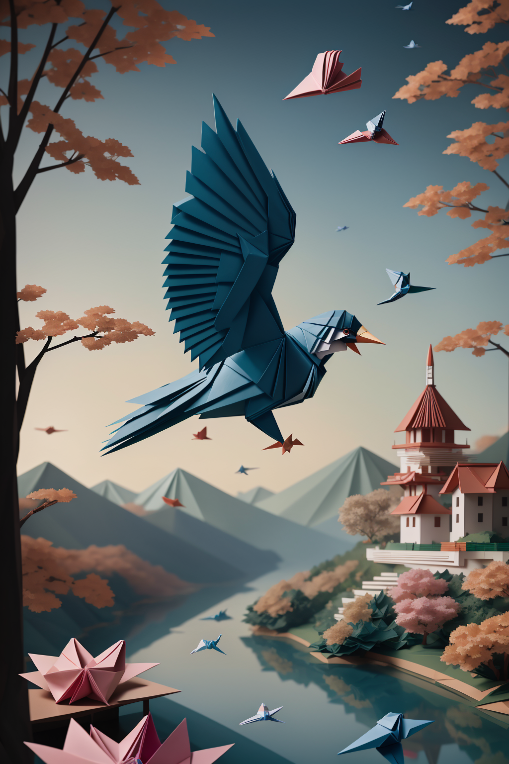 ((best quality)), absurdres, (ultra high res), ((origami)), flying bird, extreamly detailed, 8k, masterpiece, <lora:origami:0.77>