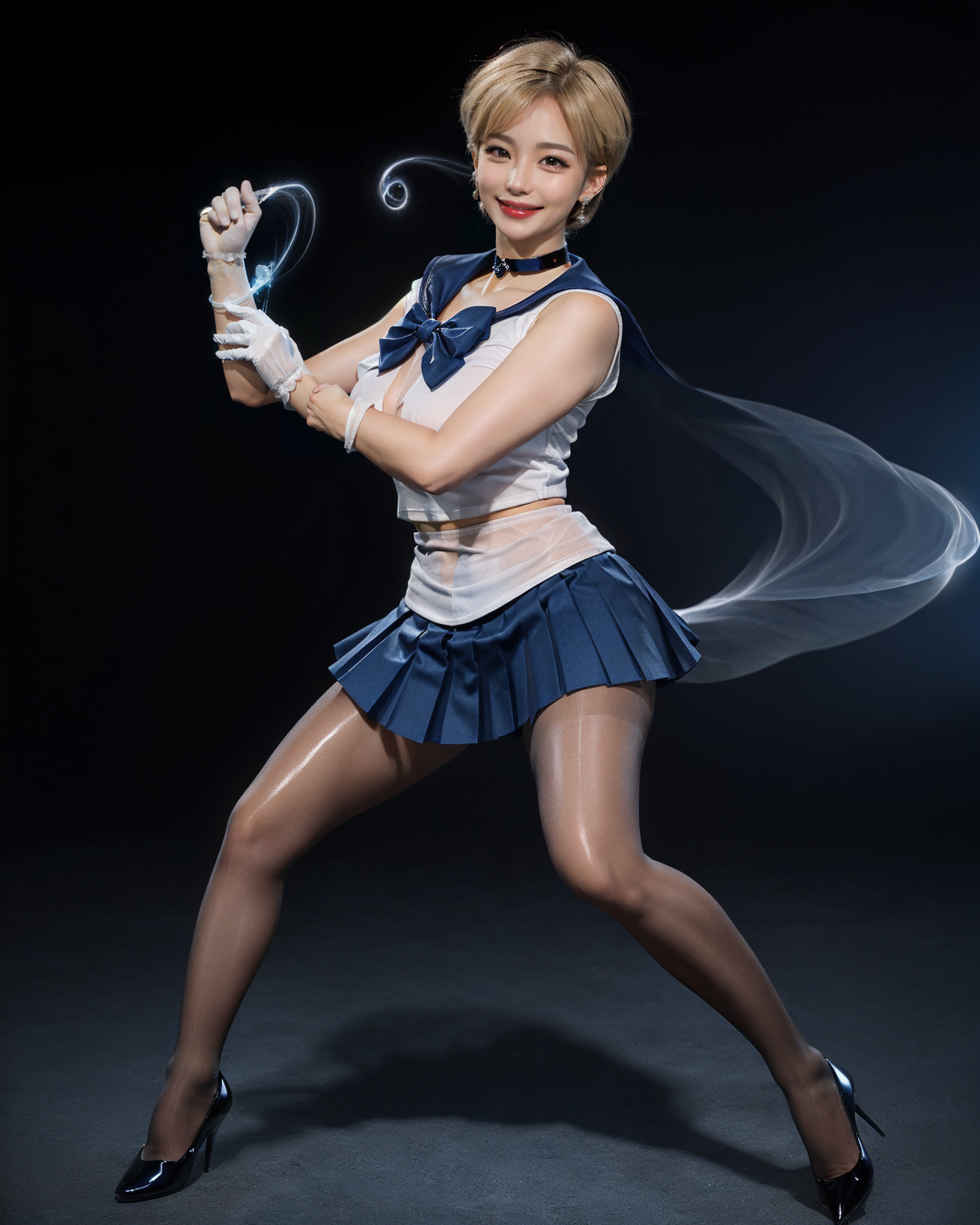 (full body:1.4), photo of a sailor uranus, (solo focus:1.4), beautiful face, (look at viewer:1.3), (pale skin:1.4), (blonde hair, parted bangs:1.4), (short_cut-hair:1.4), , back bow, blue bow, blue choker, blue gemstone, blue sailor collar, bowtie, choker, circlet, earrings, white (elbow gloves, pleated blue skirt, sailor collar, shirt:1.35), (curvy body:1.4), (huge breast:1.32), tan color (pantyhose:1.29), (cone-highheel:1.4), (kick attack pose :1.4), (Spirit realm with ethereal wisps and shimmering energy:1.3), (bright, glossy-skin, best composition, best quality, detailed:1.4), realistic <lora:sailoruranus-lora-nochekaiser:0.71> <lora:nude:0.3>