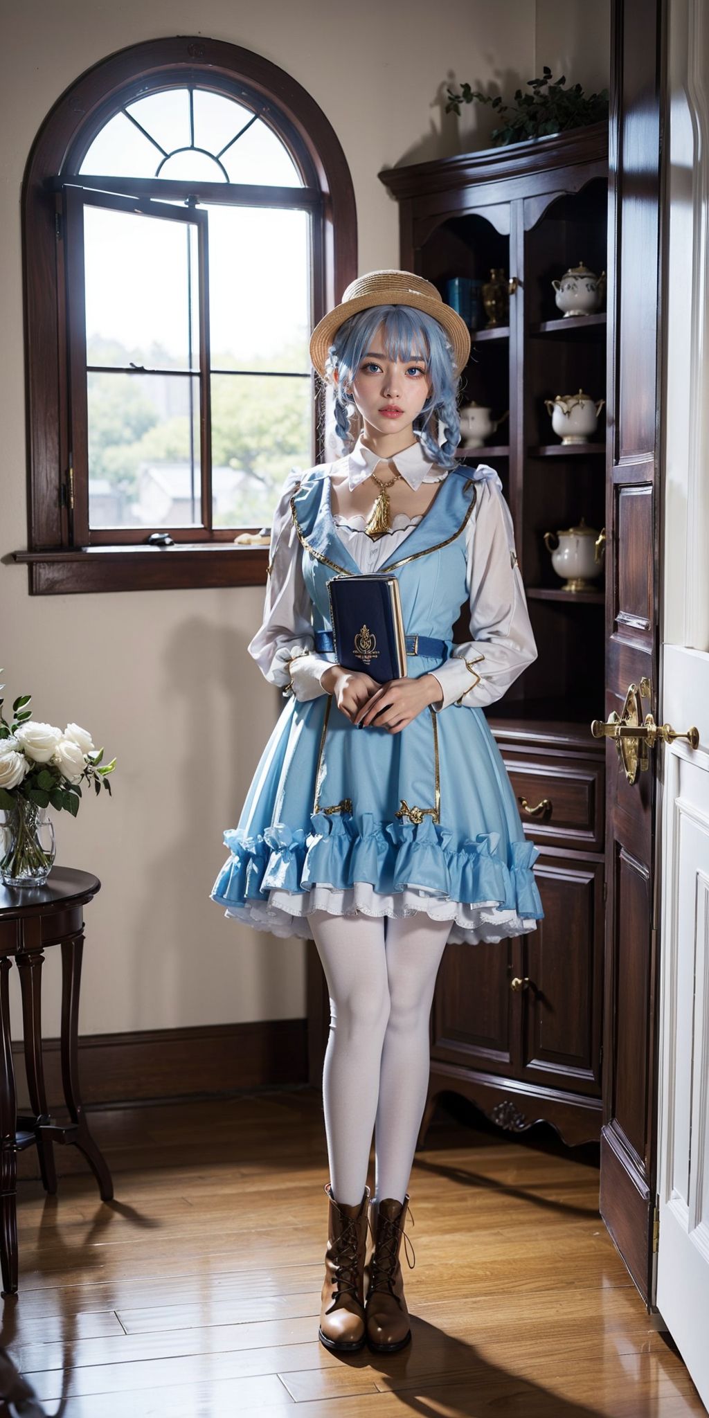<lora:ayaka:0.6>,kamisato_ayaka,1girl,hat,blue hair, braid, blue eyes, white pantyhose, brown boots, (standing naturally with no pose:1.5), full body, blue dress, indoors, decorations, doors, chandelier, book shelf, window