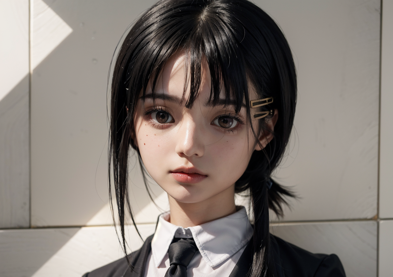1girl, collared shirt, formal, hair ornament, hairclip, iwakura lain, looking at viewer, mole, mole under eye, mole under mouth, necktie, red eyes, shirt, solo, tile floor, tile wall, tiles, wall, white shirt, x hair ornament,