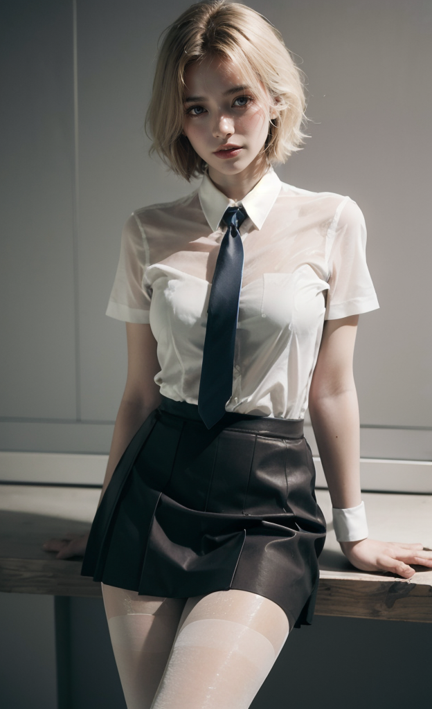 beautiful girl, blonde hair, short hair, dark solid background, soothing tones, muted colors, high contrast, (natural skin texture, hyperrealism, side lighting, sharp), medium breasts, sexy body, cowboy shot,school uniform, skirt, (((white pantyhose))), <lora:add_detail:0.4> , <lora:AWPV2:0.9>