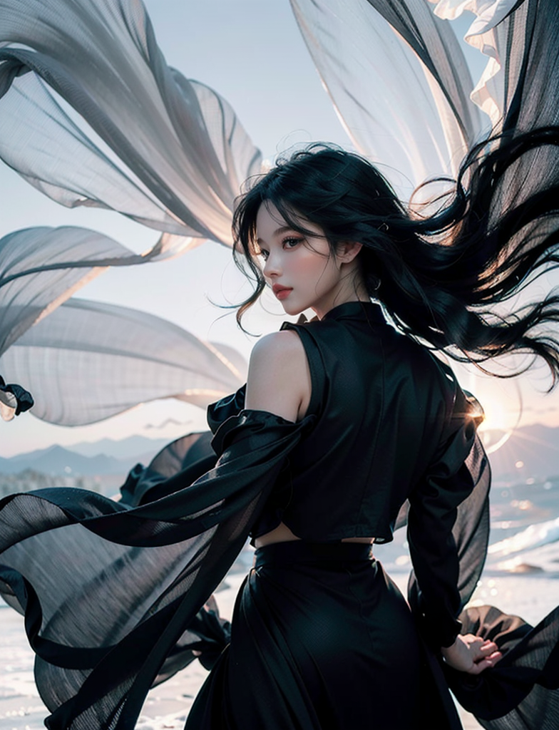 (realistic photograph:1.4) 1 girl, mature, dynamic pose, (super long flowing windy hair:1.3), twisting swirly black fabric flowing in the wind (black flowing-fabrics in the wind:1.6), nsfw, wind, dramatic lighting, (white background, rim lighting, backlight, contre-jour:1.5), deep shadows, contrast, silhouette <lora:flowing-fabrics:1.2> <lyco:GoodHands-beta2:1.0> <lora:betterCuteAsian:0.3>