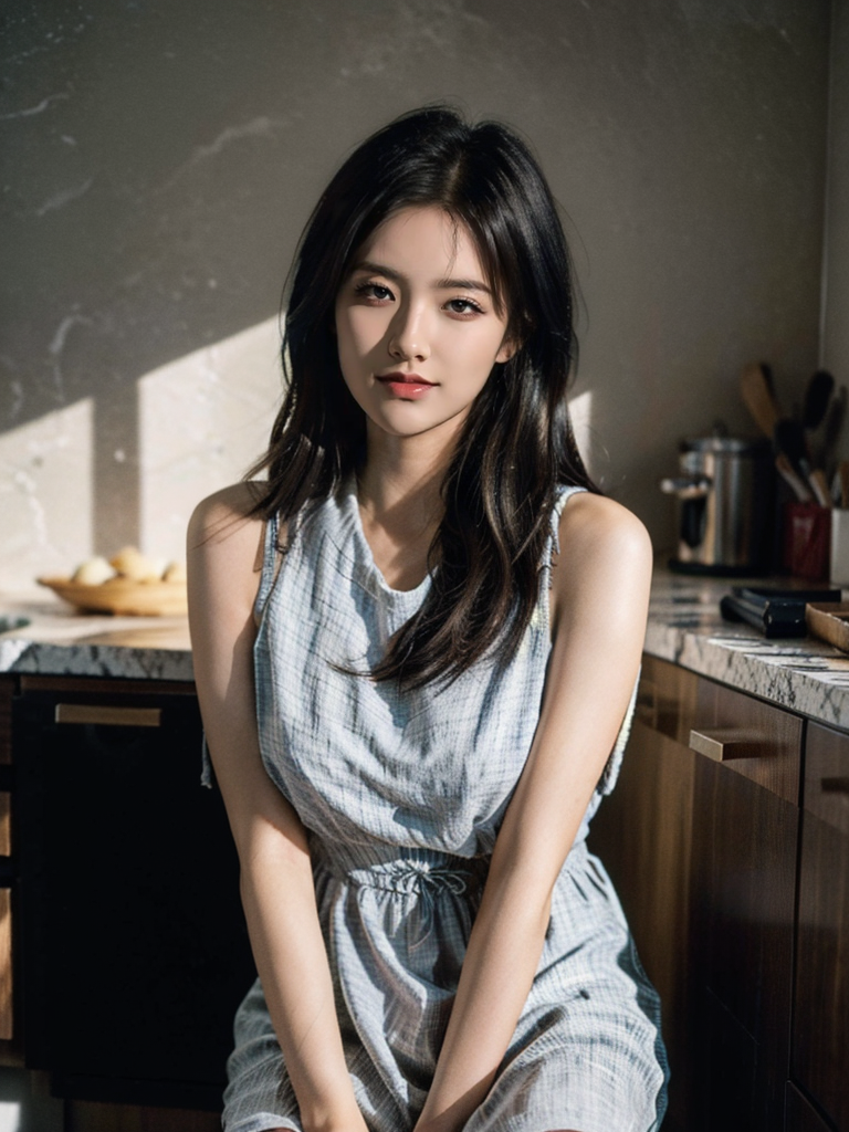 (camera setting ISO 400 F4 85mm shutter speed 1/60),(cinematic look:1.4),soothing tones,insane details,intricate details,hyperdetailed,high contrast,(soft cinematic light:1.1),best quality,masterpiece,ultra high res,(photorealistic:1.3),8K,raw photo,1girl,natural skin texture,(sitting in the kitchen:1.2),beauty,natural skin texture,dynamic pose,long hair,film grain,smiling,movie,<lora:beauty girl solo face_20:0.5>,<lora:FilmVelvia3:0.7>,<lora:tifa_v2.3:0.2>,<lora:ran:0.1>,