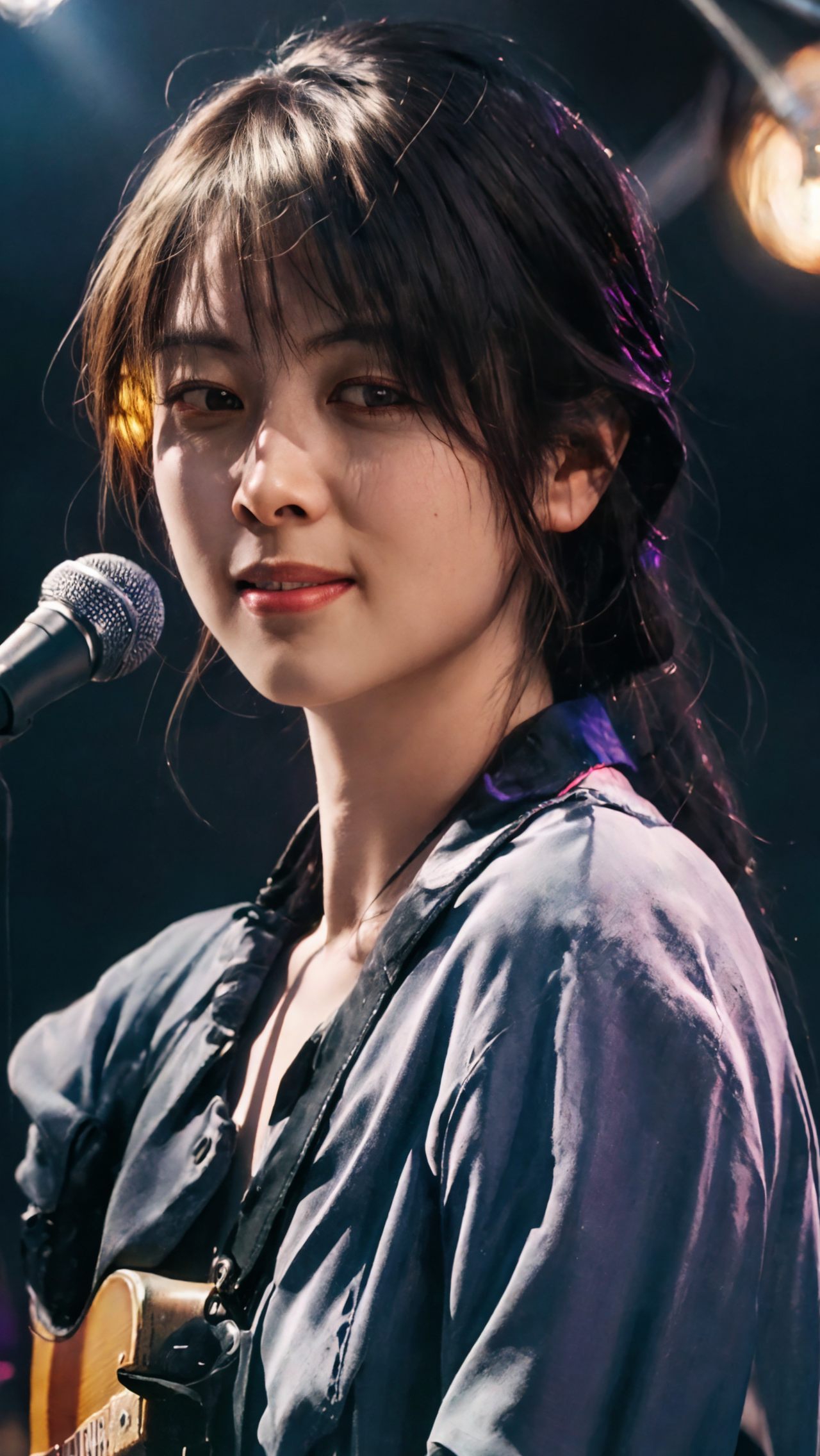 ultra wide angle shot,cinematic style,8k,RAW photo,photo-realistic,masterpiece,best quality,highres,extremely detailed,intricate details,absurdres resolution,High quality texture,detailed texture,vivid color,professional lighting,radiosity,photon mapping,physically-based rendering,High quality shadow,Ray tracing,perfect body,perfect face, Luminescent choker,Luminescent Belt,night club,Bokeh,Depth of field 270mm,halo of angelic light Headdress,smile,studio lighting,playing a bass guitar,band,music festival,theatrical, <lora:banjingquanshui:0.8>