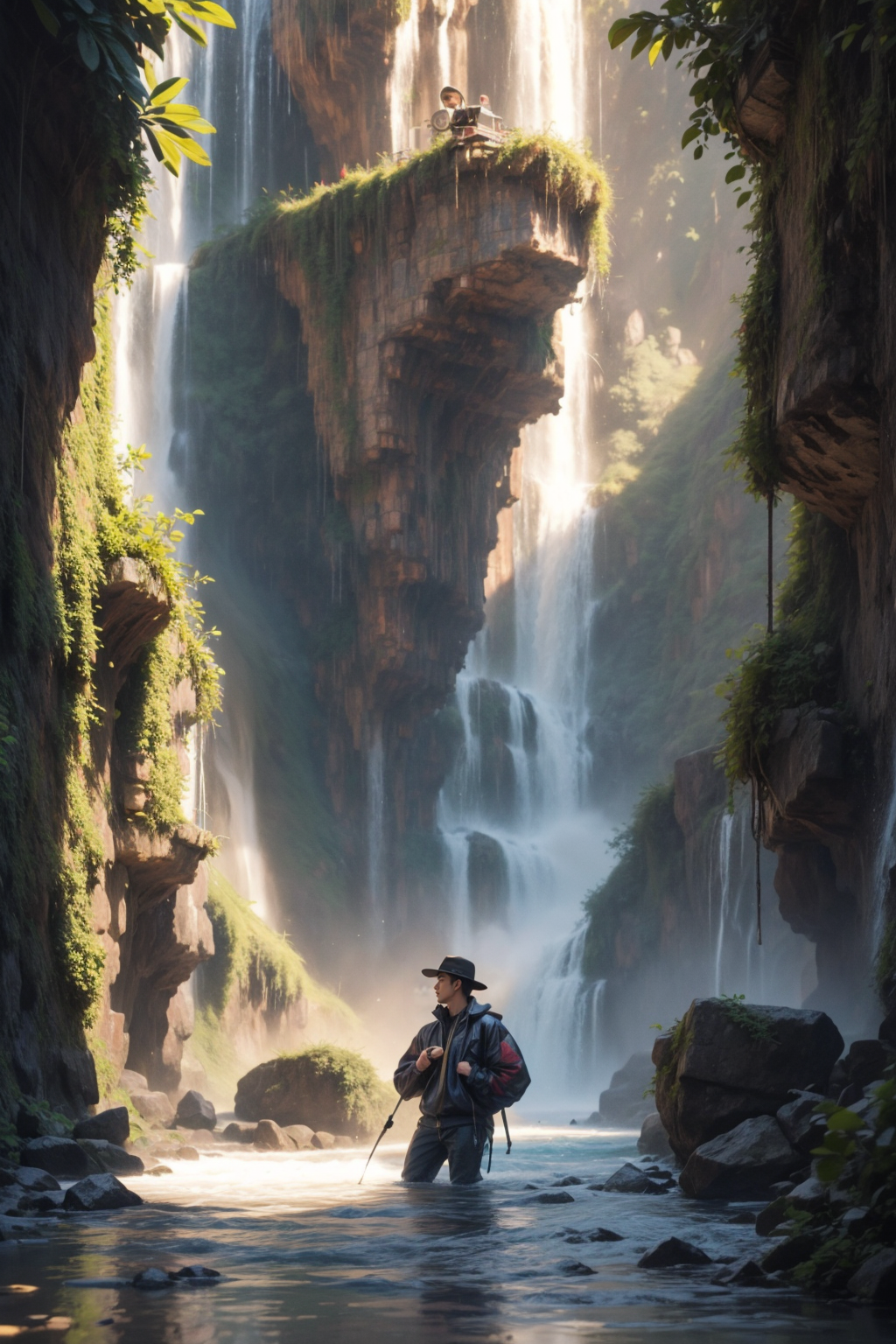 (Realistic),masterpiece,best quality,cinematic lighting,natural shadow,highest detail,professional photography,detailed background,depth of field,insane details,intricate,aesthetic,detailed face,subsurface scattering,realistic hair,realistic eyes,Long Shot,Taper cut, masculine,photo of a handsome man,full body,dynamic pose, Sturdy shoes, quick-dry clothing, hat, sunglasses,water-resistant outerwear, <lora:Neobro2:1>, <lora:weight_slider_v2:0.5>,<lora:muscle_slider_v1:1>, <lora:add_detail:1>,<lora:jianzhu:1>, Breathtaking gorges, towering cliffs, crystal-clear rivers, lush vegetation, thrilling adventures, natural wonders,