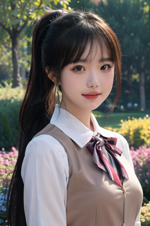best quality,masterpiece,realistic,HDR,UHD,8K,Highly detailed,1girl,long hair,ponytail,radiant face,sparkling eyes,blush,school uniform,background flower garden,looking at viewer,