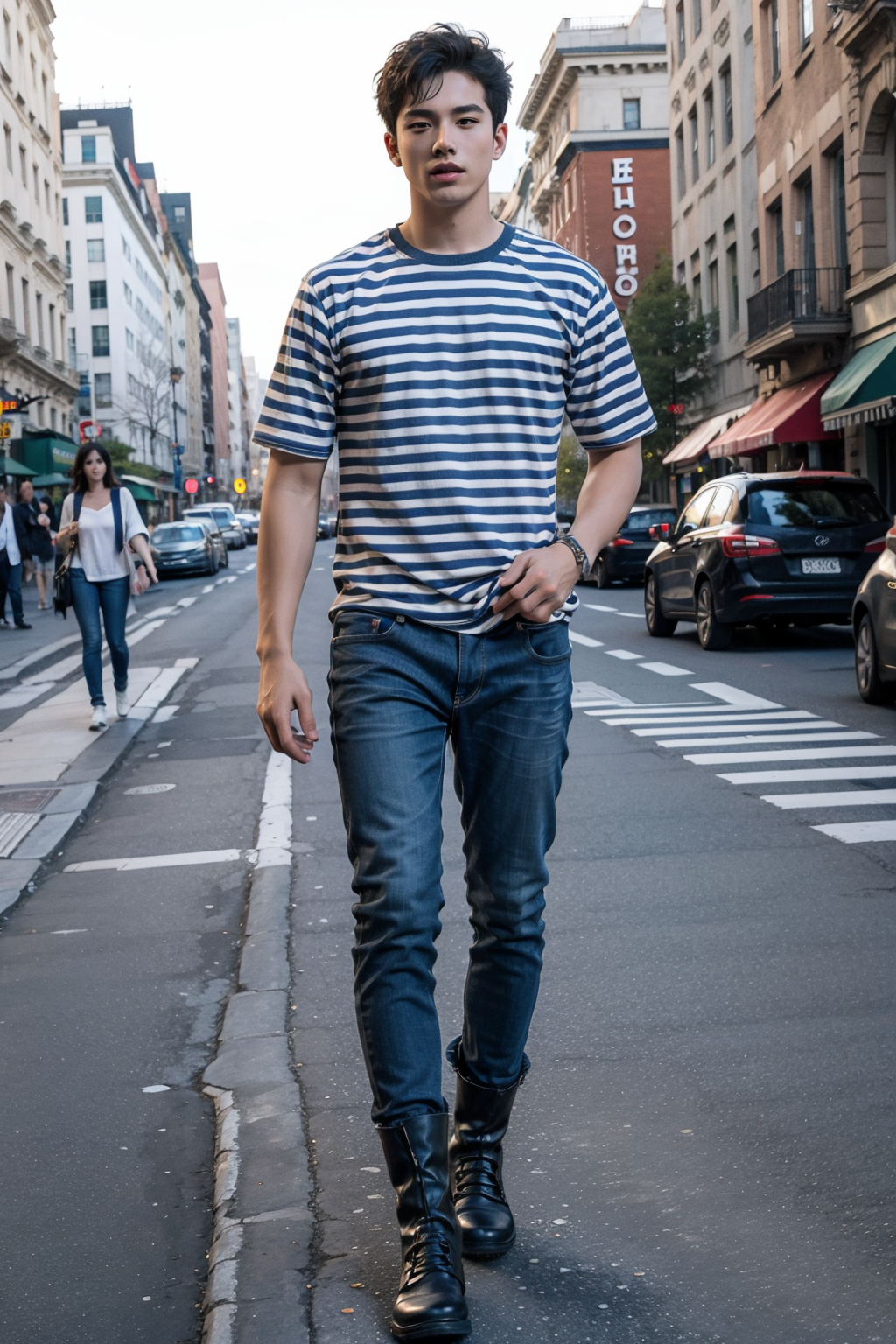 1boy,short hair,striped shirt,full body,jeans,Leather boots,<lora:haihun:0.8>