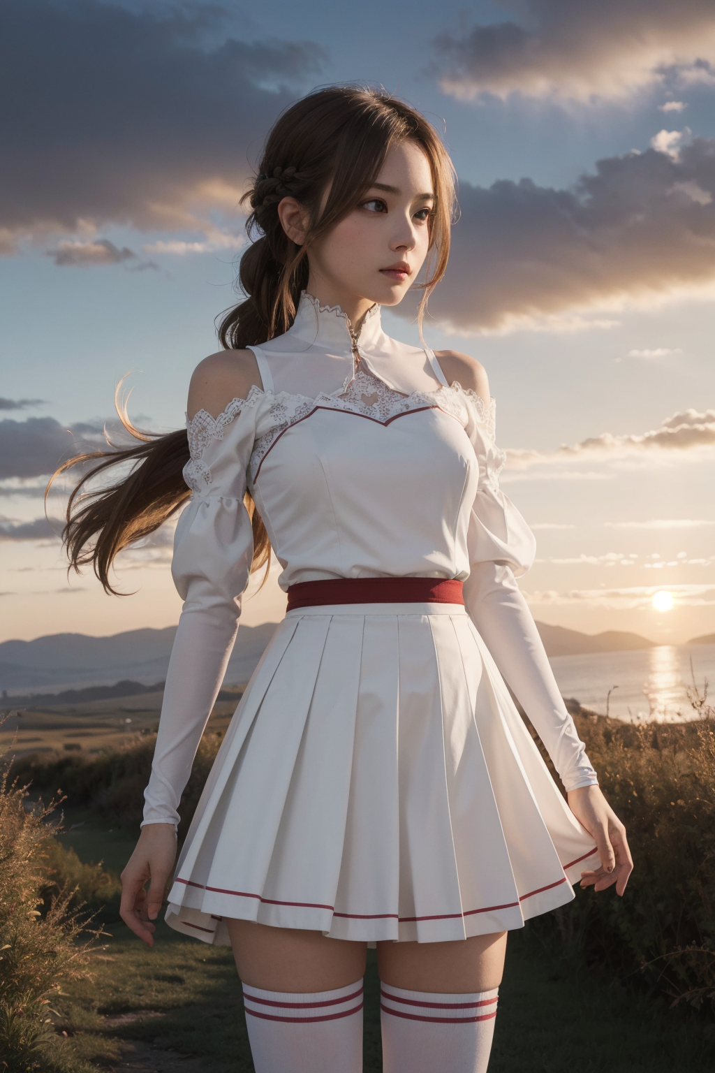 masterpiece, best quality, highres, aaasuna, long hair, brown hair, braid, brown eyes, bare shoulders, armor, breastplate, white sleeves, detached sleeves, red skirt, pleated skirt, white thighhighs, <lora:asuna_(sao)_v1:0.7>, sunset, standing, cowboy shot,