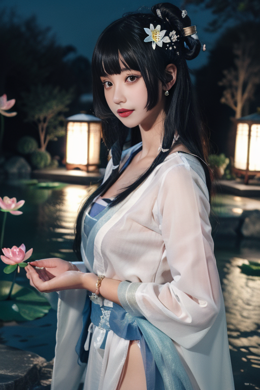 ultra-detailed,highly detailed,best quality,masterpiece,illustration,realistic, type 95 sbzql, 1girl, solo, looking at viewer,upper body, hanfu, chinese clothes, sash, bandeau, dress, see-through,long sleeves, earrings, jewelry, bracelet,dudou,tube dress,camisole under clothes, long hair, hair ornament, bangs, outdoors,lotus,water, flower, rock,photo background,night,steam, <lora:type 95 sbzql_v1_08:0.7>