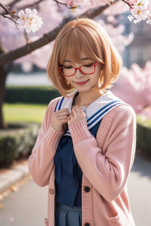 ltra-detailed,highly detailed,best quality,masterpiece,illustration,realistic, mirai kuriyama, 1girl, solo, glasses, school uniform, short hair, red-framed eyewear, closed eyes, cardigan, bob cut, serafuku, outdoors, blurry, tree, hands on own chest, pink hair, lips, day, realistic, long sleeves, sunlight, cherry blossoms, upper body, branch, ahoge, orange hair, blurry background, skirt, depth of field, blonde hair, own hands together, sailor collar, smile, bangs, flower, blue shirt, <lora:mirai kuriyama_v1_09:0.7>