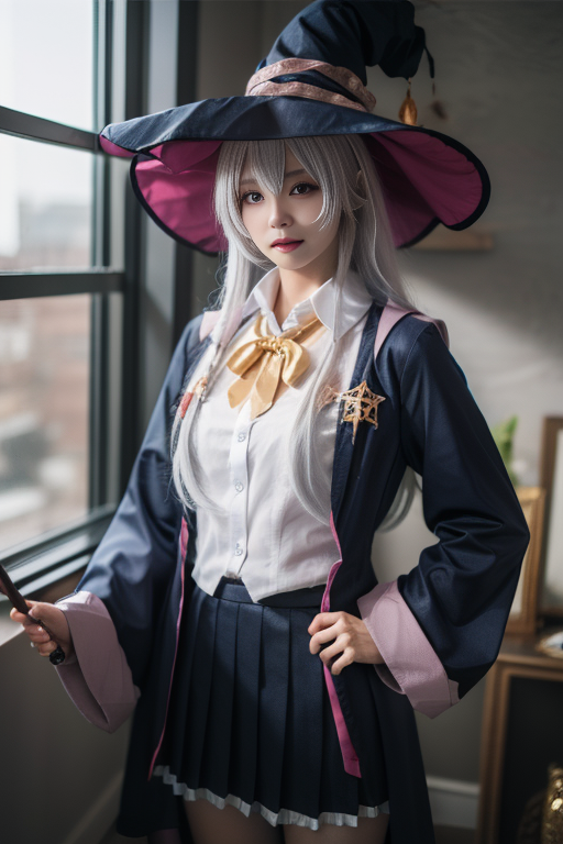 ltra-detailed,highly detailed,best quality,masterpiece,illustration,realistic,photorealistic, elaina, witch, wizard, elaina \(majo no tabitabi\), cosplay, 1girl, solo, open robe, collared shirt, long sleeves, wide sleeves, pleated skirt, witch hat, bowtie, frilled skirt, jewelry, badge, long hair, bangs, hair between eyes, grey hair, hair ribbon, hair bow, looking at viewer, cowboy shot, standing, indoors, window, day, <lora:elaina_v1_06:0.8>