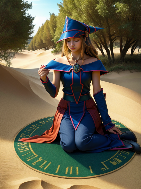 (masterpiece,best quality:1.5), ultra realistic,32k,RAW photo,(high detailed skin:1.2), 8k uhd, dslr, high quality, film grain, magician girl, (tree), spell caster, spell circle, in the sand <lora:dark_magician_girl_offset:0.8> yu-gi-oh card, card, <lora:yugioh:0.8>, (masterpiece,best quality:1.5)
