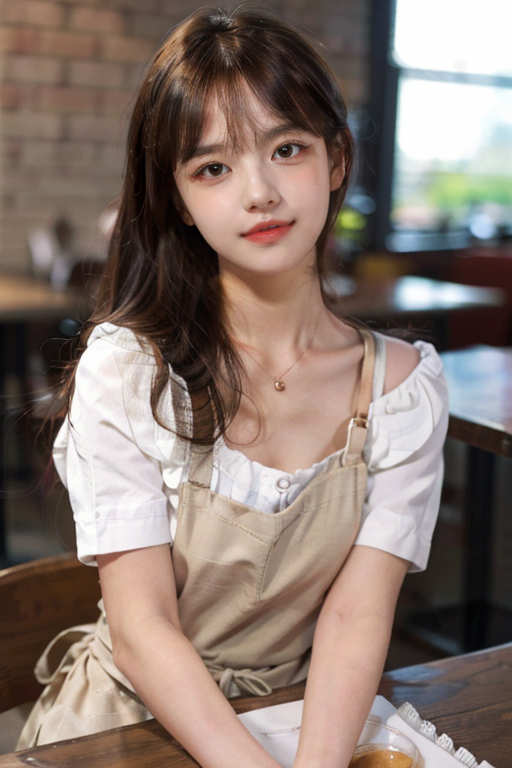 (((masterpiece))), best quality, ultra-detailed, illustration, vintage cafe, detailed cafe, (blurry background:1.1), part time job female, mature female, cute face, dark brown long hair, ponytail, ultra-detailed, (beautiful detailed eyes), detailed eyes, (((masterpiece))), gentle smile, (solo_focus), upper body, white collared shirt, apron,window side, sunrise, light rays, (nice hands, perfect hands), <lora:jtz:0.7>