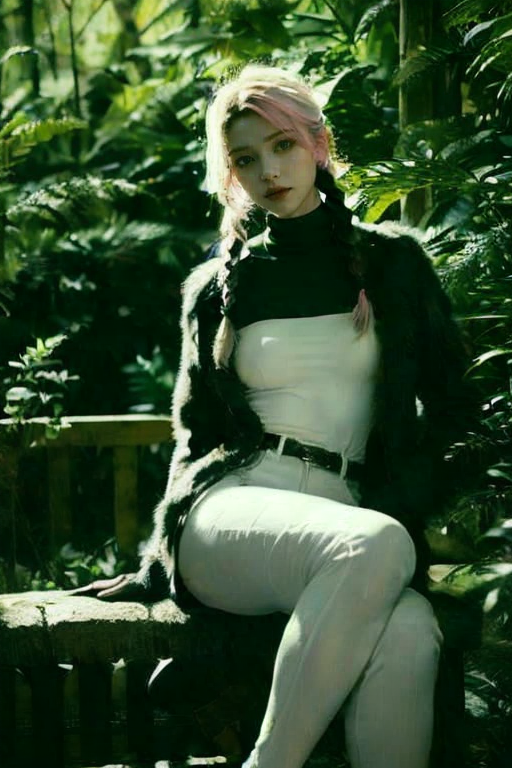 ((ultra realistic:1.3)),((best quality:1.3)),((masterpiece:1.2)) (illustration),(hyper detailed),(high quality),(((1girl, solo))),mature female,small hands,small_head,perfect face,perfect hand,ray tracing:0.7, Mohawk braids,Light Pinkcolor hair,dark browncolor eyes,Jealousy,Size H breasts,lankybody,looking to the side,Moonlit Castle on a Cliff's Edge,Forest_Green_Turtleneck_BodysuitBlack_Wide_Leg_TrousersBrown_Faux_Fur_CoatSilver_Cuff_BraceletBlack_Satin_Clutch,control-top pantyhose,wedge heels,face only,Sunlight through leaves or branches creating patterns (Leaf/Branch Patterns).,Hands clasped behind the head,reclining,sexy,<lora:Electronic Patina:1.5>,