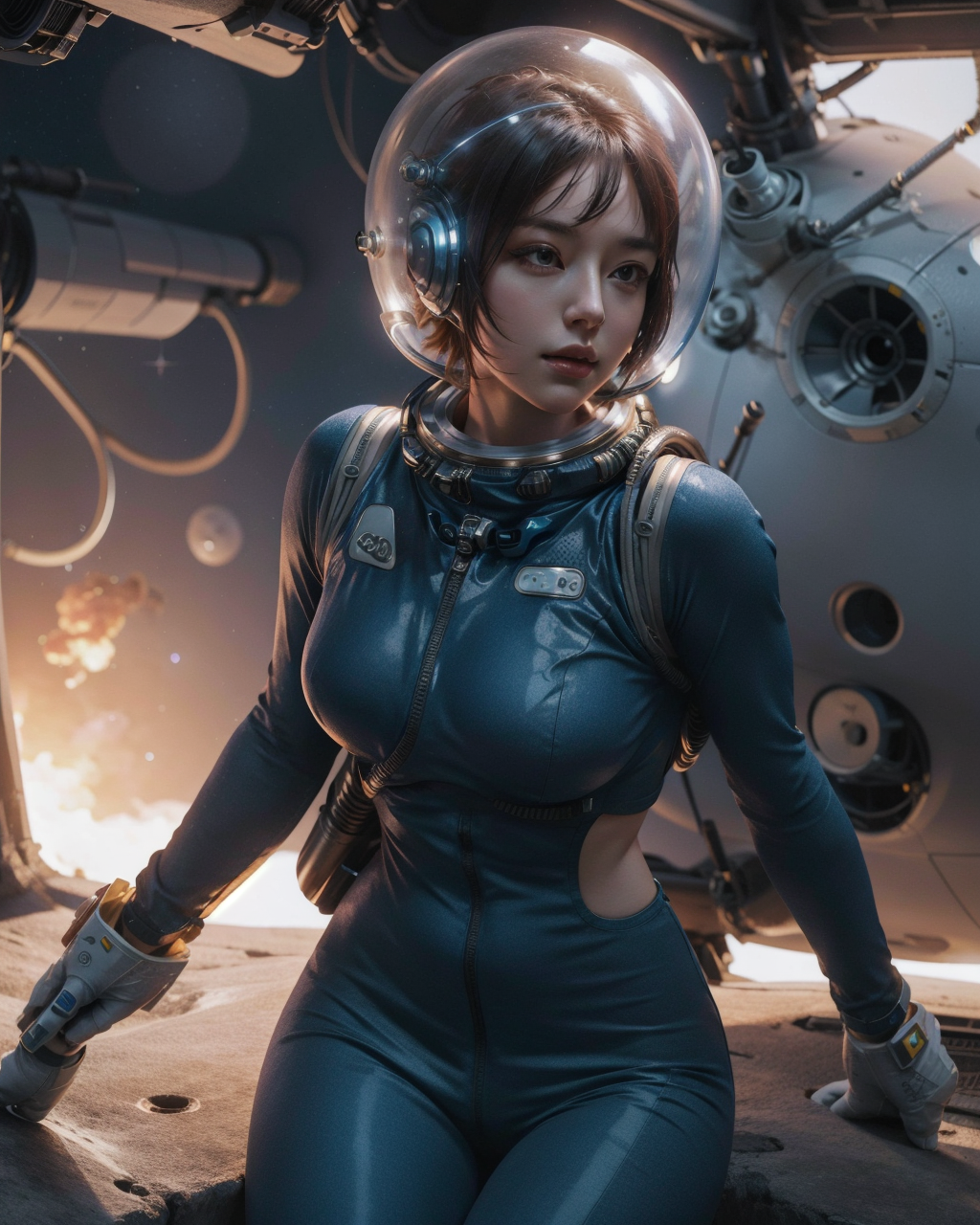 <lora:Astropunk:1>Astropunk woman in a space suit astronaut with a gun in hand, masterpiece, highres, photorealistic, best quality, perfect lighting, 8k, realistic, photo-realistic, ultra-detailed,
