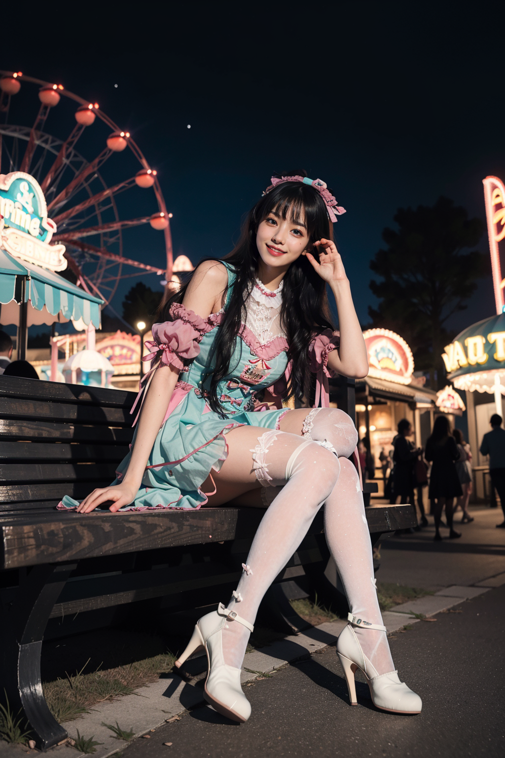 realistic, photorealistic, masterpiece, incredibly absurdres, extremely detailed, best quality, 1girl, long black hair, blunt bangs, light smile, slim, full body, sitting, looking at viewer, sweet_dress, white thighhighs, amusement park, night, night sky, dramatic lighting, <lora:sweet_dress_style2_v1:0.7>