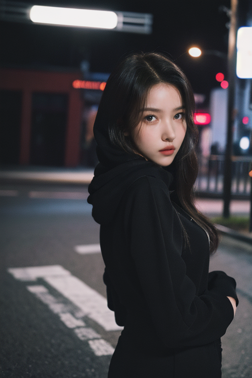 ujifilm XT3, 8k,close up photo, masterpiece, best quality, (((1girl))), solo,realistic, ((looking at viewer)), photorealistic, (extremely detailed face), looking at viewer, ((ultra-detailed eyes and pupils)), ultra detailed, serious expression, ((standing city street at night)), hoodie, (arms behind back), <lora:sowonlorashy:1>