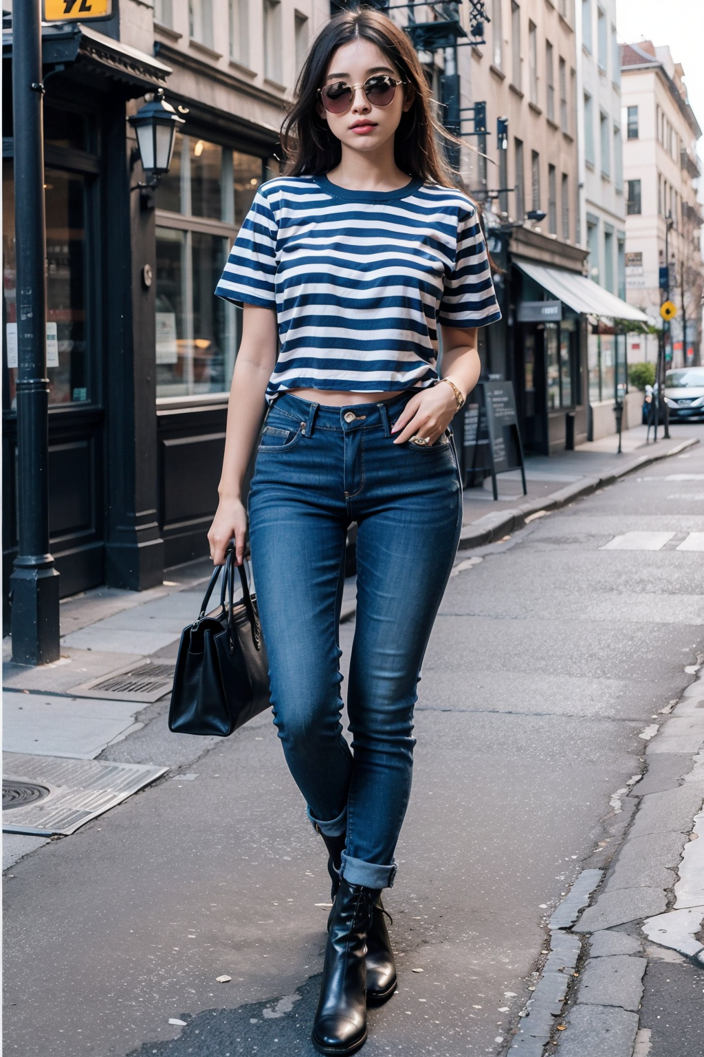 1girl,long hair,striped shirt,full body,jeans,Leather boots,<lora:haihun:0.8>