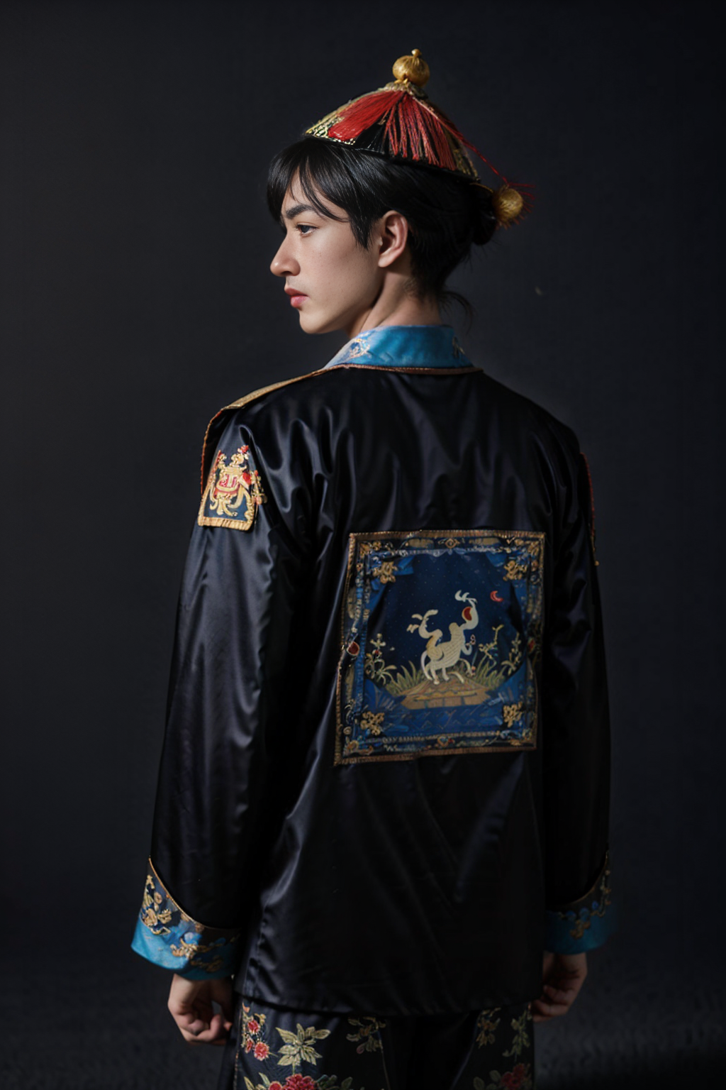 handsome male,look at viewer, chinese mandarin court necklace beads,auspicious cloud pattern embroidery pants,chinese qing dynasty official first grade military officials uniform,a large peacock feather be attached to the back of the hat,<lora:qingchaoguanfu:0.6>