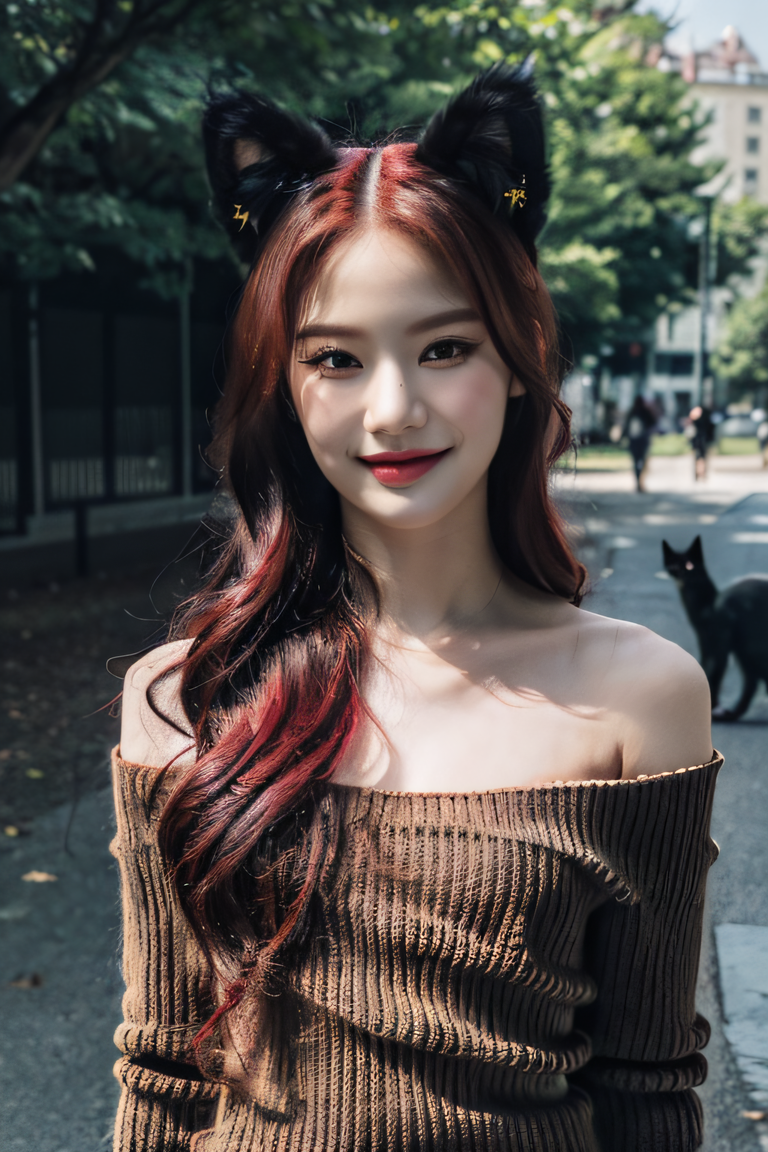 (masterpiece:1.2, best quality), (best illumination, an extremely delicate and beautiful), highres, sharp focus, 1girl, <lora:ISAV5:0.9>, red hair, a beautiful furry woman, (furry:1.2), (small black cat ears:1.5), (finely detailed beautiful eyes:1.2), ((beautiful detailed face)), at the park, outside, daylight, (upper body), (wearing an oversized off shoulder wool sweater), slender, looking at viewer, facing the viewer, straight in the middle, wide hips, (smirk smile), (red lipstick:0.7),